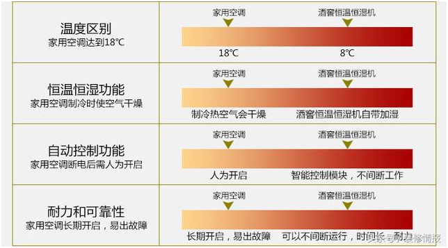 看完了上圖,答案顯而易見。家用空調(diào)的溫度無法達(dá)到酒窖的要求,無法做到恒溫恒濕,并不適宜用在酒窖當(dāng)中。酒窖恒溫恒濕空調(diào)有高精度,低故障率、耐用等優(yōu)點(diǎn),還能自動(dòng)調(diào)節(jié)室內(nèi)溫度、濕度,這是一般家用空調(diào)不具備的。所以,為了美酒更好的儲(chǔ)存,還是選擇專業(yè)的酒窖恒溫恒濕機(jī)比較好。